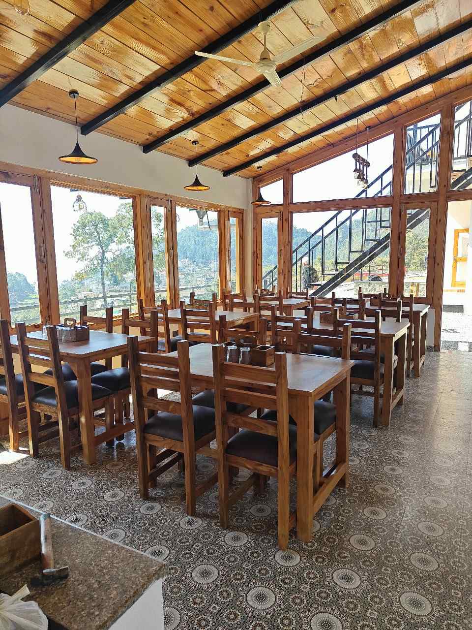 - Pine forest on one side and mountain view