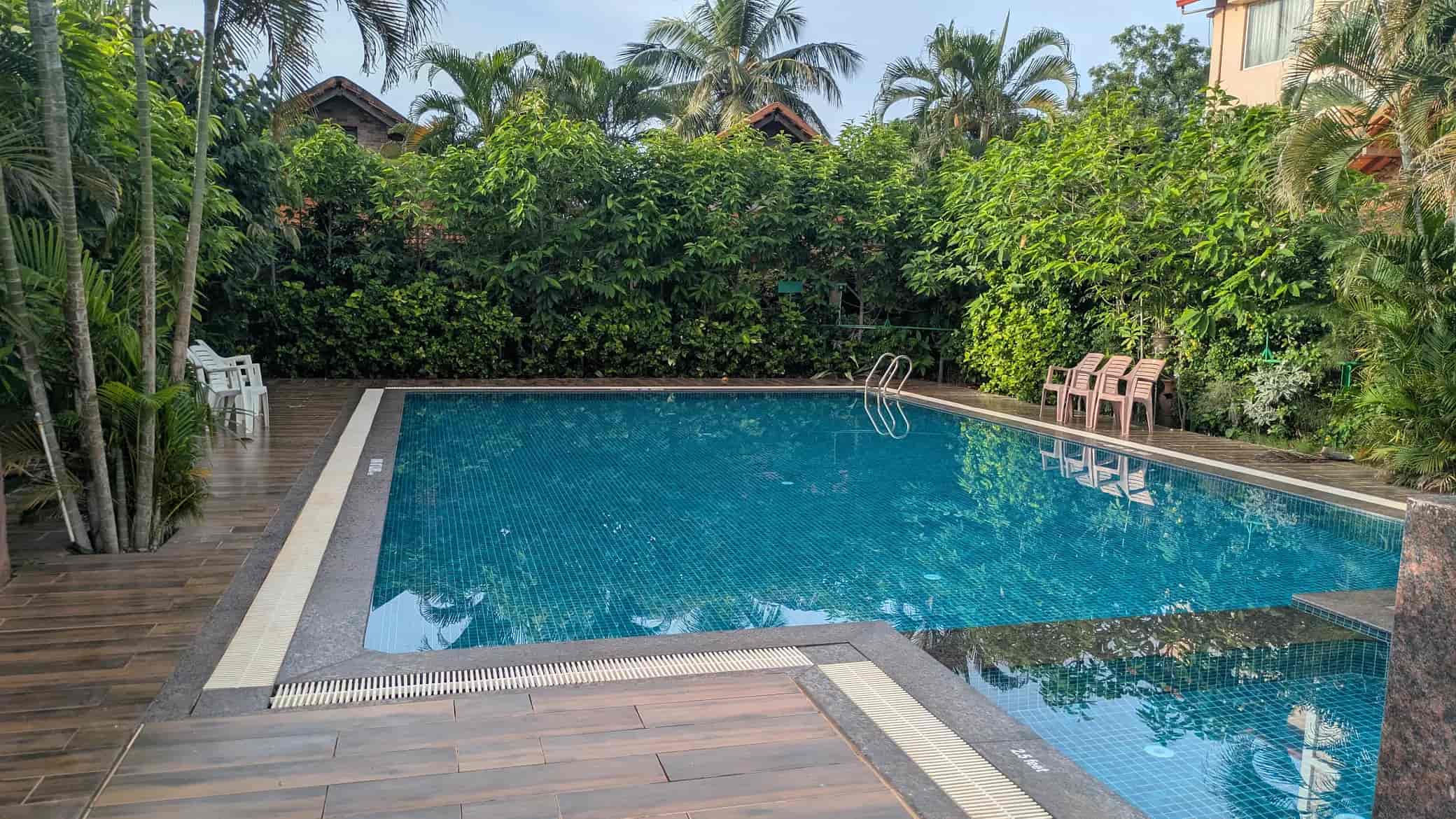 - Lush greenery around with large swimming pool.