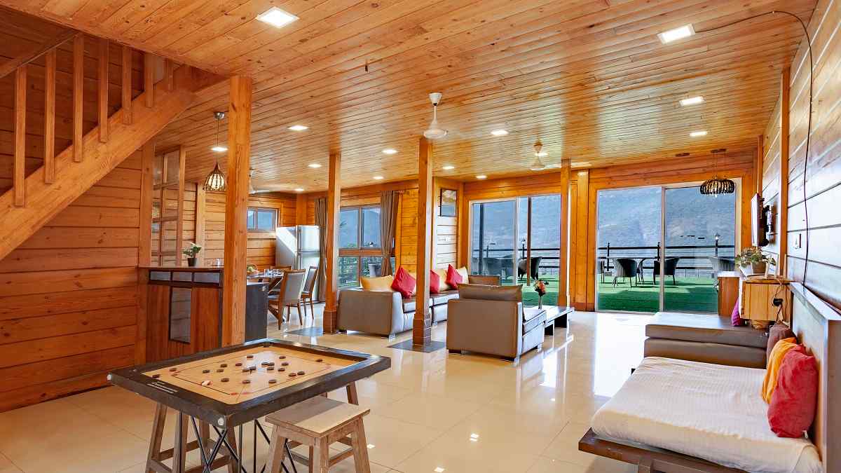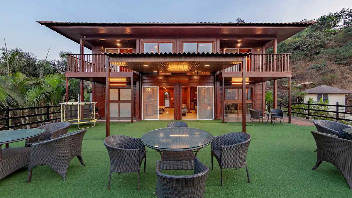- Wooden stay with lush greenery around.