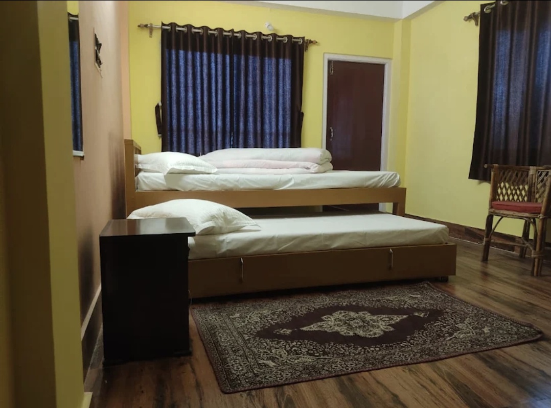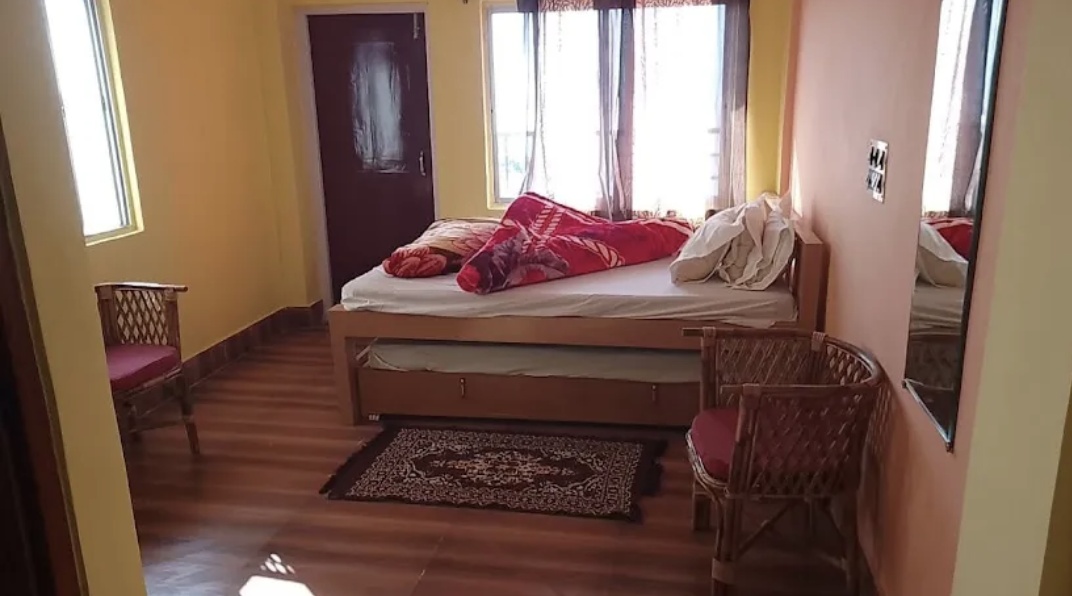 Escape to a hidden paradise embraced by graceful deodar trees, offering stunning mountain views and the soothing sounds of birds.