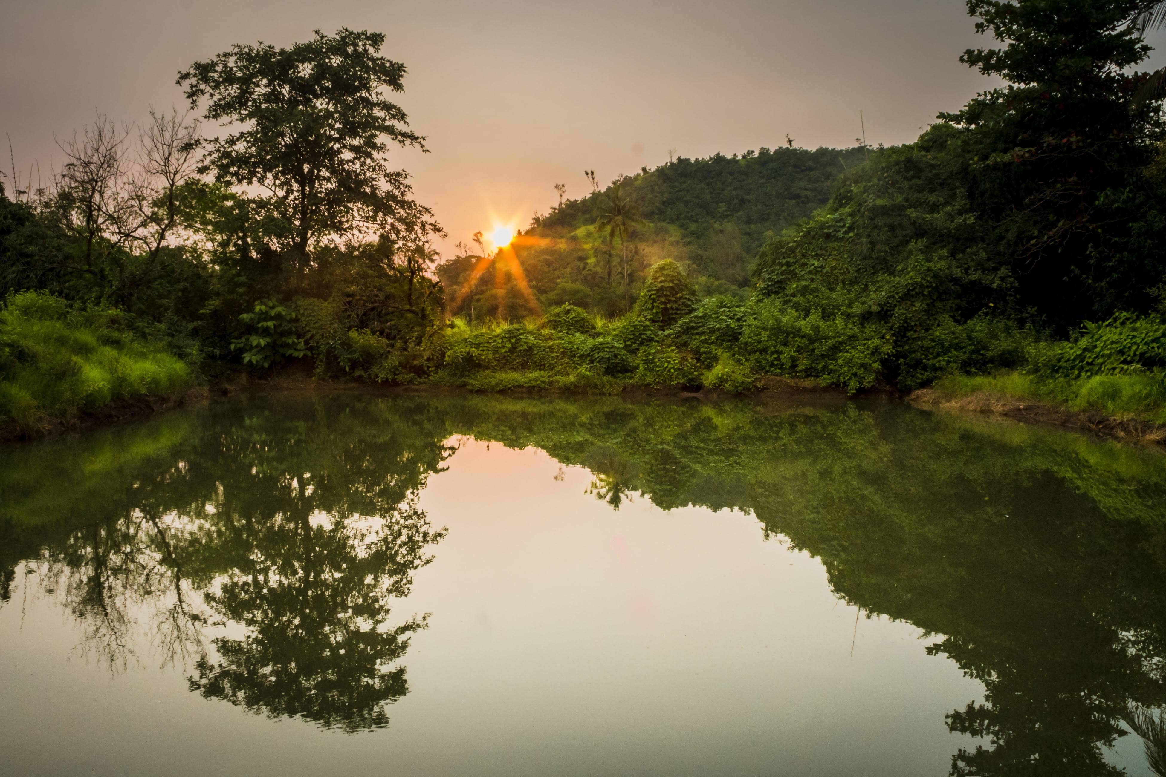 Right by the lakeside, surrounded by greenery in a lush jungle setting.